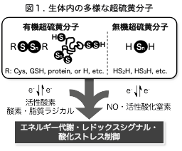 これらの分子は、従来よく知られてきた硫化水素やチオール化合物と比較して、高い求核性とレドックス活性を有し、タンパク質システイン残基の修飾や電子移動反応を介して、細胞内シグナル制御、酸化ストレス応答、エネルギー代謝調節、免疫応答など、多様な生体機能を制御することが示されています(図1)。私たちは、これらの高反応性硫黄分子を総称して「超硫黄分子」と定義し、その化学的特性と生理機能の解明を進めています。