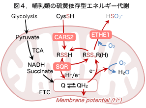 微生物においては、硫黄化合物を電子受容体として利用する硫黄呼吸が広く知られています。近年の研究から、哺乳類細胞においても超硫黄分子が電子伝達反応に関与し、ミトコンドリア機能やエネルギー代謝の制御に関与する可能性が示されています(図4)。