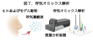 本研究室では、自然に吐く息(呼気)中に含まれる生体代謝物を網羅的に解析する「呼気オミックス(breath omics)」技術の開発を進めています(図7)。