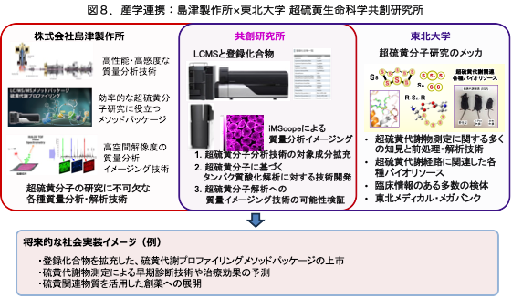 具体的な例として、2025年4月より、「島津製作所×東北大学 超硫黄生命科学共創研究所」が設置され、生体の老化メカニズムに関連する超硫黄分子の特性を明らかにして、様々な疾患の診断や治療法の確立、健康を増進する機能性食品の開発への貢献を目指した、共同研究を展開しています(図8)。